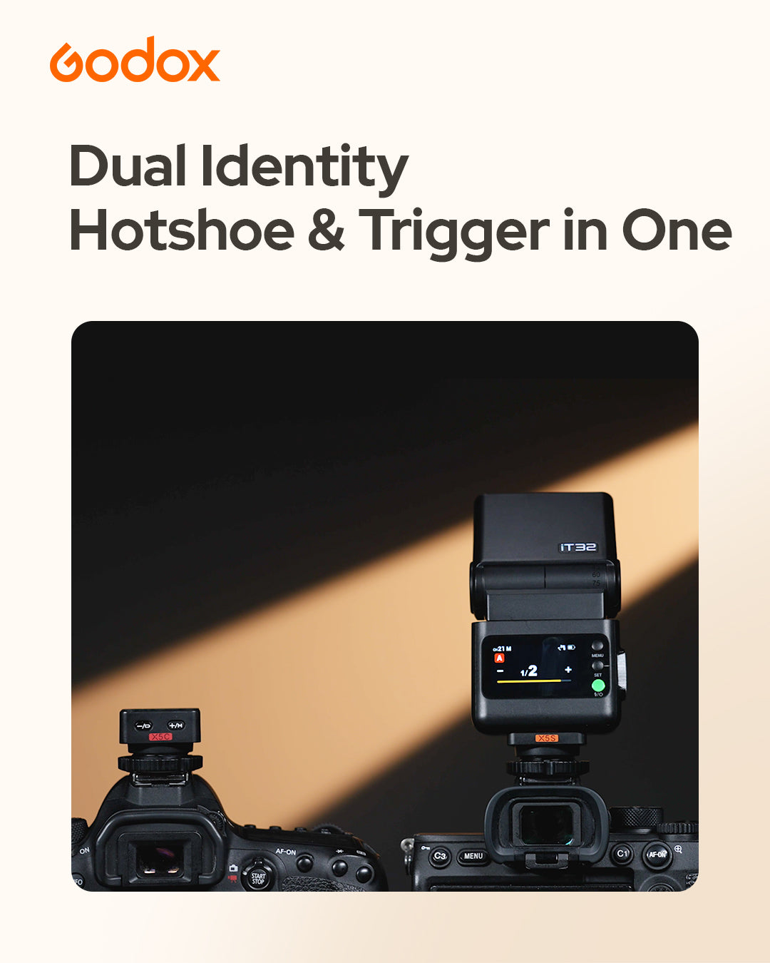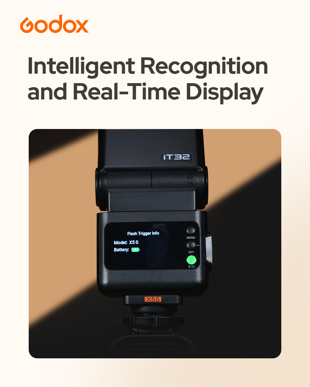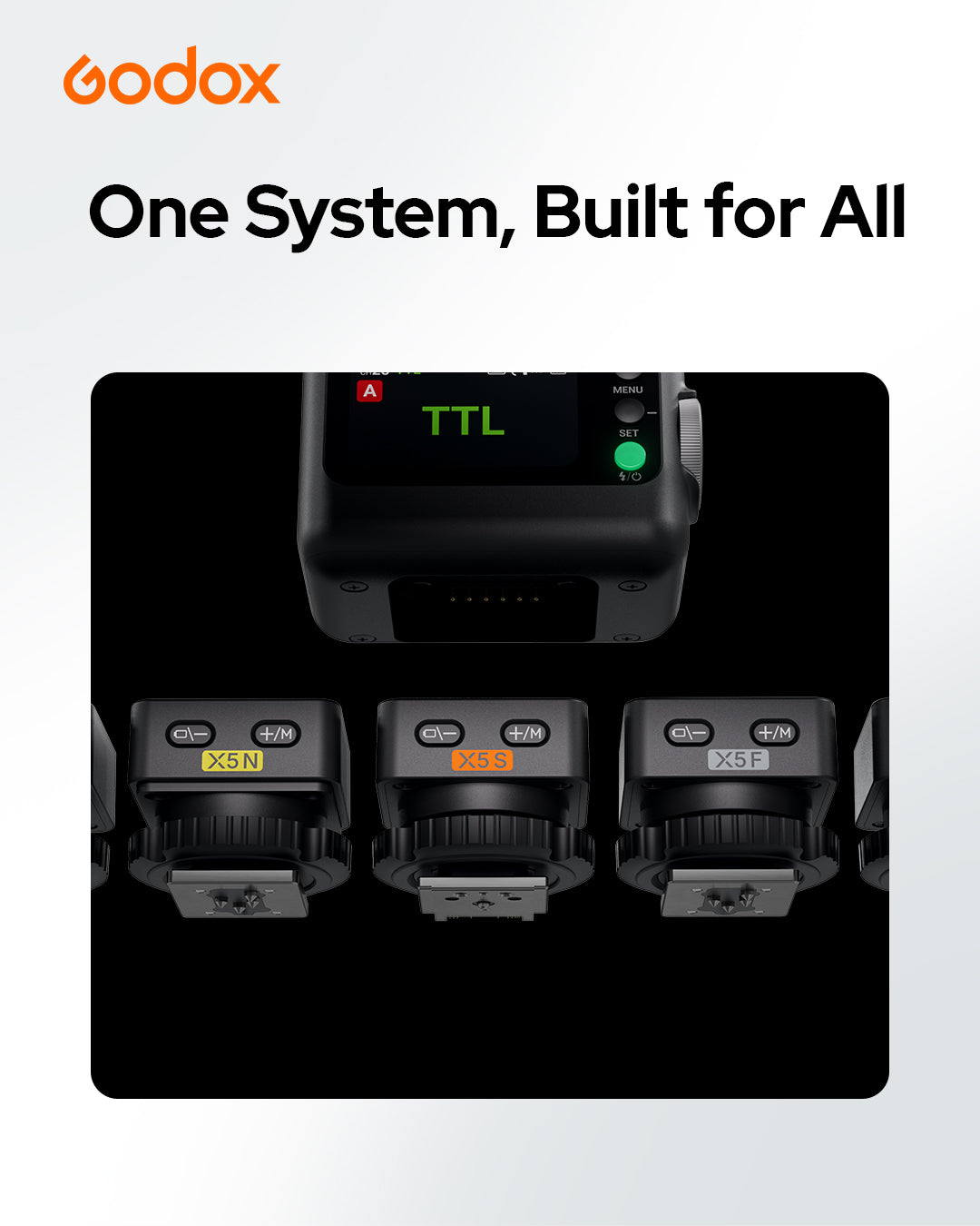 | X5について | ・Canon/Nikon/Sony/Fujifilm/OM System 用モデルを用意 ・Godox X ワイヤレスシステムに完全対応 ・iT32を装着したまま、オフカメラ多灯制御も可能 ・軽量23gの超小型ユニット |