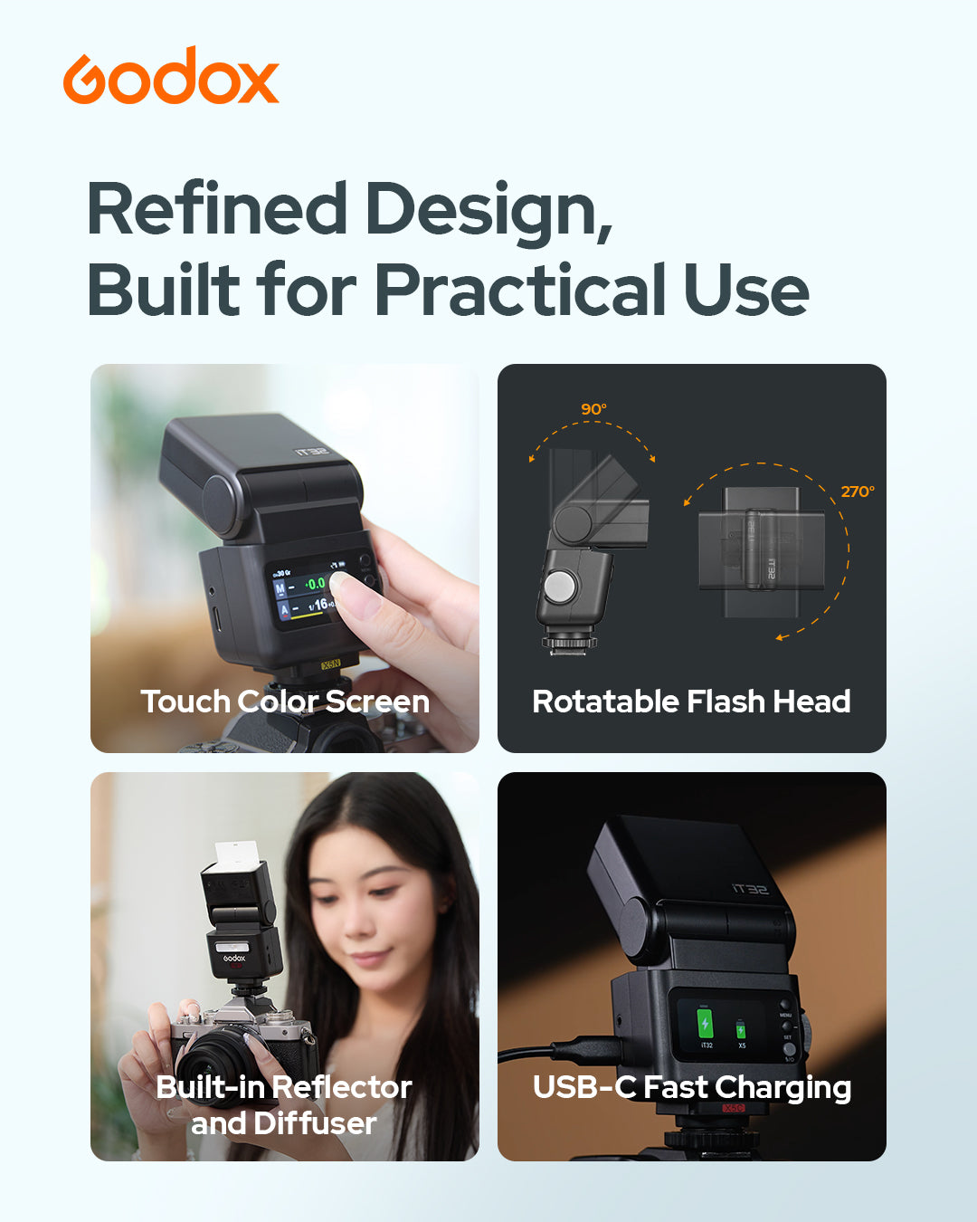 | iT32について | ・フルカラータッチ操作メニュー ・バウンス対応ヘッド(縦約90°/横約270°) ・内蔵ディフューザー+キャッチライト板搭載 ・LEDモデリングライトで光の事前確認が可能 ・TTL/マニュアル/Multi/先幕・後幕シンクロ/HSS対応 ・GN18(ISO100)ながらコンパクトで携帯性抜群 |