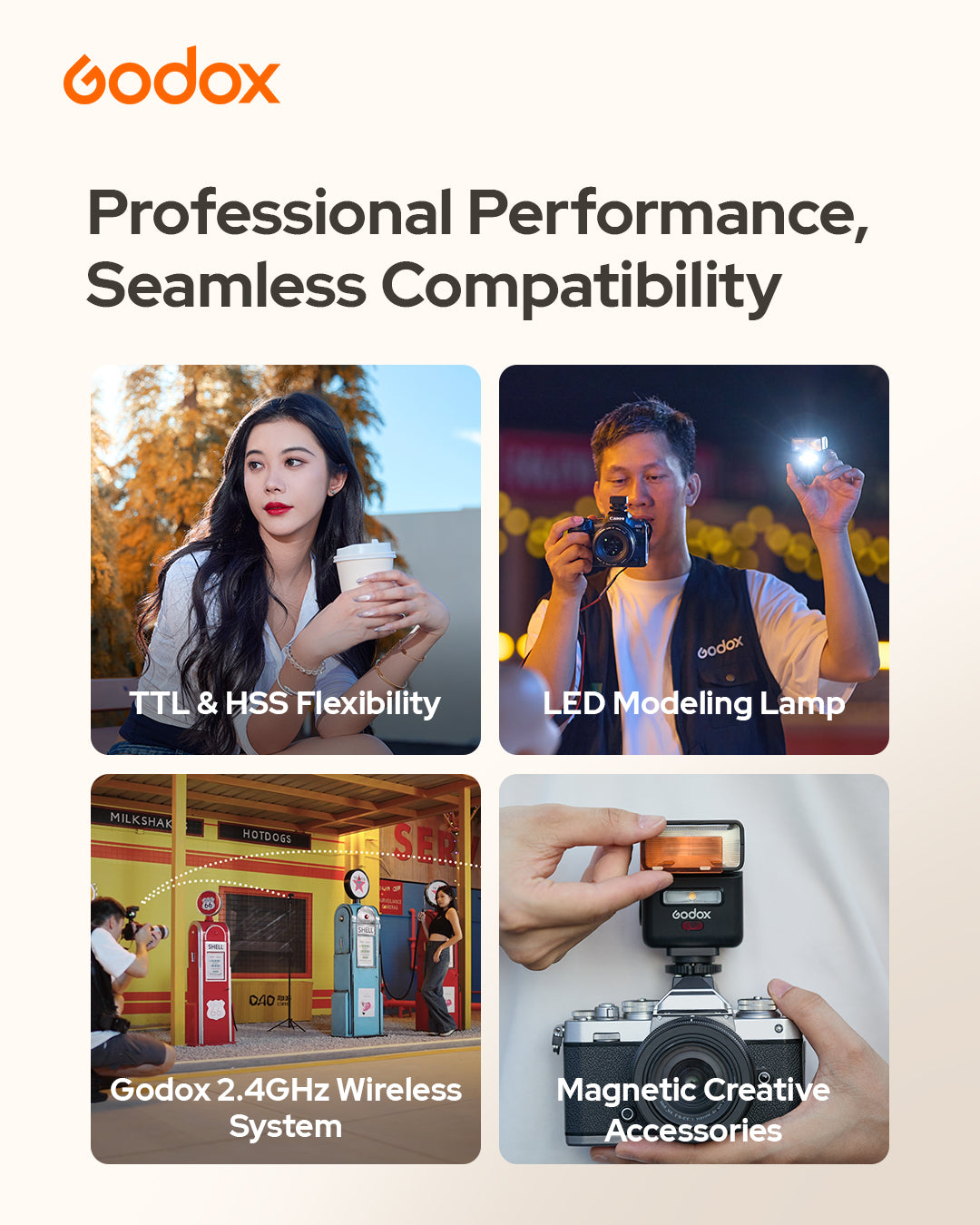 | 主な特長 | ・X5の交換で主要5ブランドに対応 ・TTL/HSS(最大1/8000、Sonyは1/80000)対応 ・磁気モジュール設計でワンタッチ着脱 ・Godox 2.4GHz ワイヤレスXシステム対応 ・最大80mの安定通信(分離トリガー20m) ・軽量コンパクトボディでも高性能発光 ・LEDモデリング、内蔵ディフューザー&キャッチライト板 ・タッチUIで直感的設定変更 |